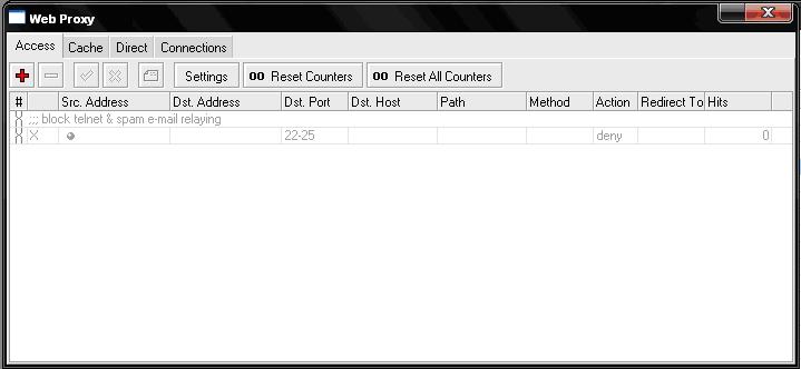 - Blok telnet, ssh, dan spam-email relaying. Caranya klik IPà Proxy, pada tab "access" tekan tombol '+' untuk menambah aturan web proxy, isi seperti gambar dibawah: